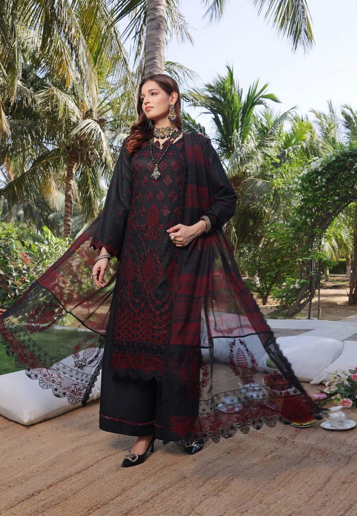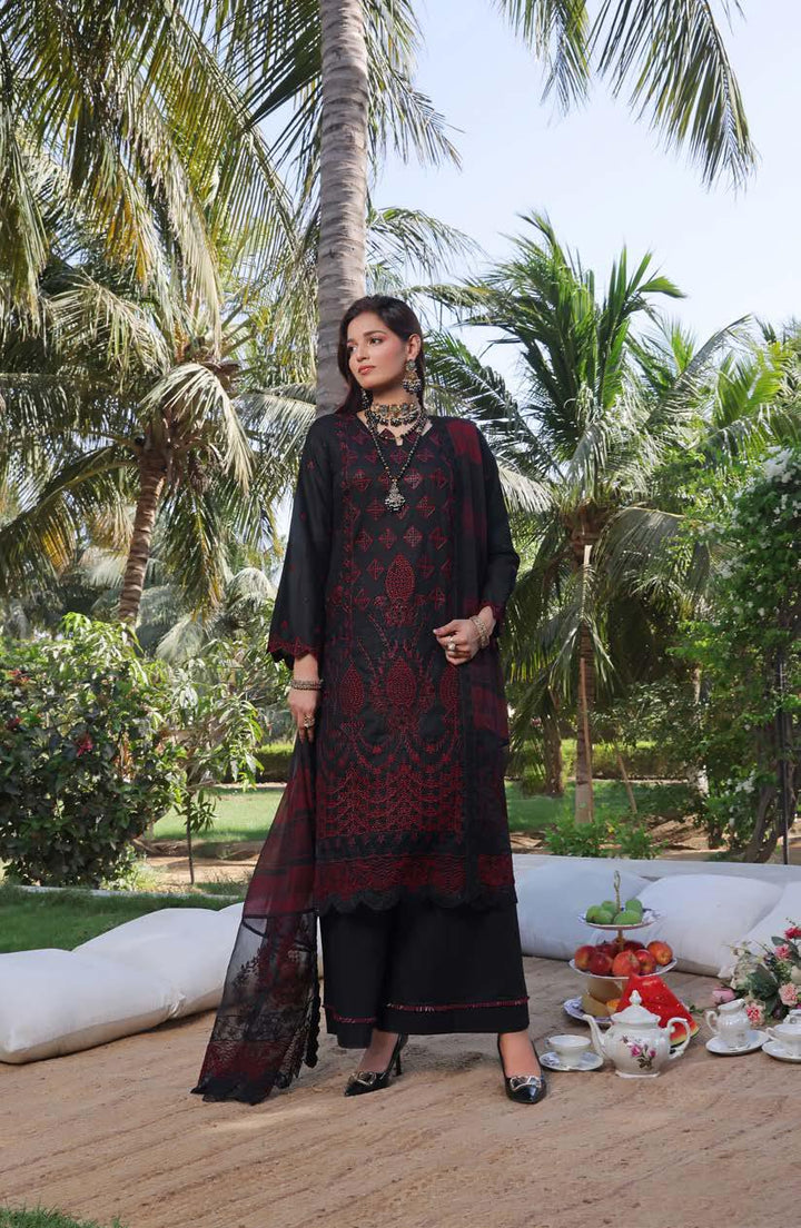 HMS-6101 Premium Chikankari Embroidered Lawn - Unstitched Black/Mehroon