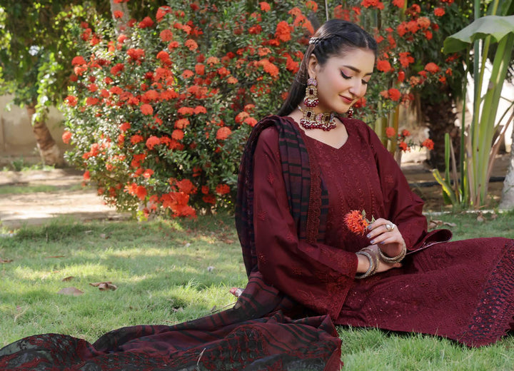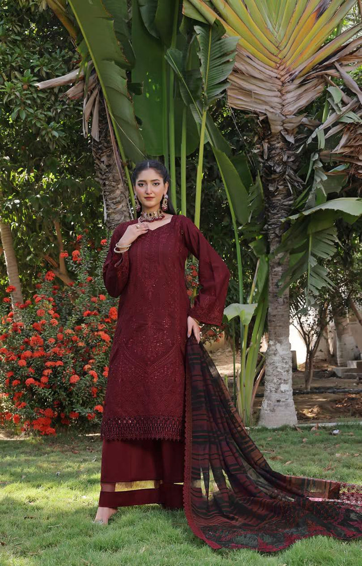 HMS-6106 Premium Chikankari Embroidered Lawn - Unstitched Mehroon